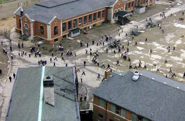 The Shawshank Redemption Prison Location. The film starred, Tim Robbins, Morgan Freeman and William Sadler. Andy stands on the yellow line upon his arrival to the prison.